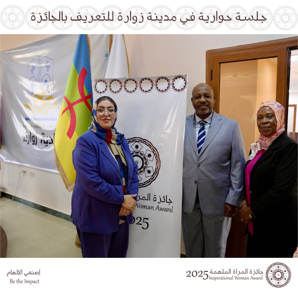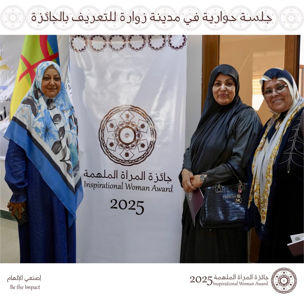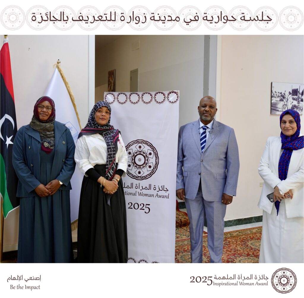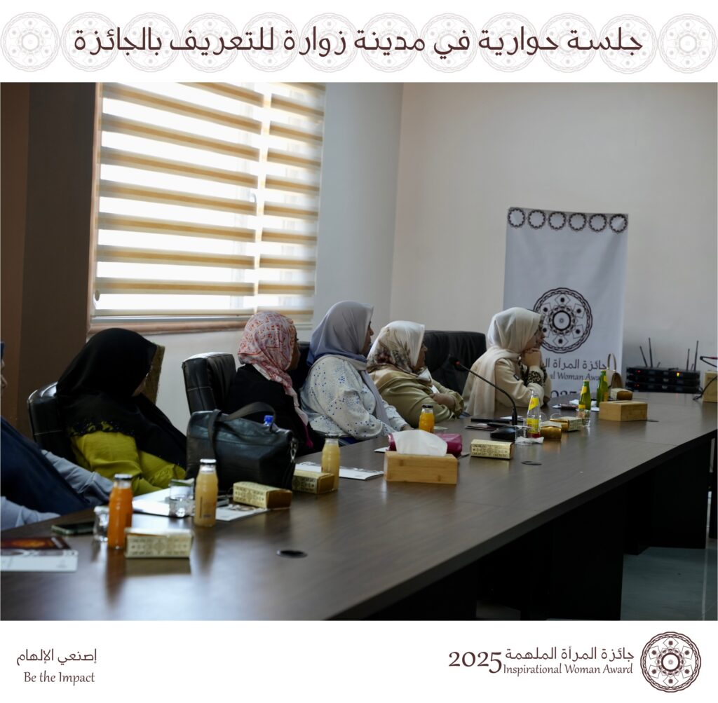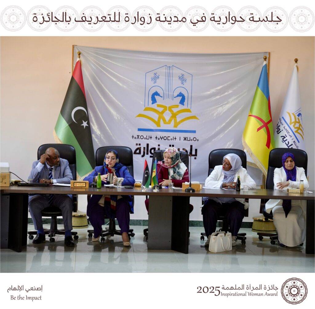 في إطار مسيرة جائزة المرأة الملهمة للتعريف برسالتها على مستوى مدن ليبيا المختلفة، استضافت مدينة زوارة جلسة حوارية موسّعة بعنوان “دور المرأة في المجتمع”. وقد خُصصت هذه الجلسة لعرض مراحل الجائزة والتعريف بآلياتها، إلى جانب تسليط الضوء على انعكاساتها في إبراز قصص النساء الملهمات وإسهاماتهن في مختلف الميادين.